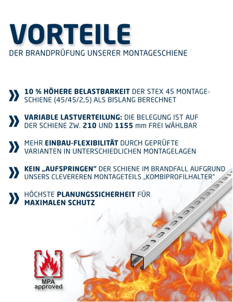 Ennek fényében a Stex 45 szerelősínünket (45/45/2,5), a kombinált profiltartóval és S fogazott lemezzel együtt átfogó tűzállósági vizsgálatoknak vetettük alá az Anyagvizsgáló Intézetben (MPA) .